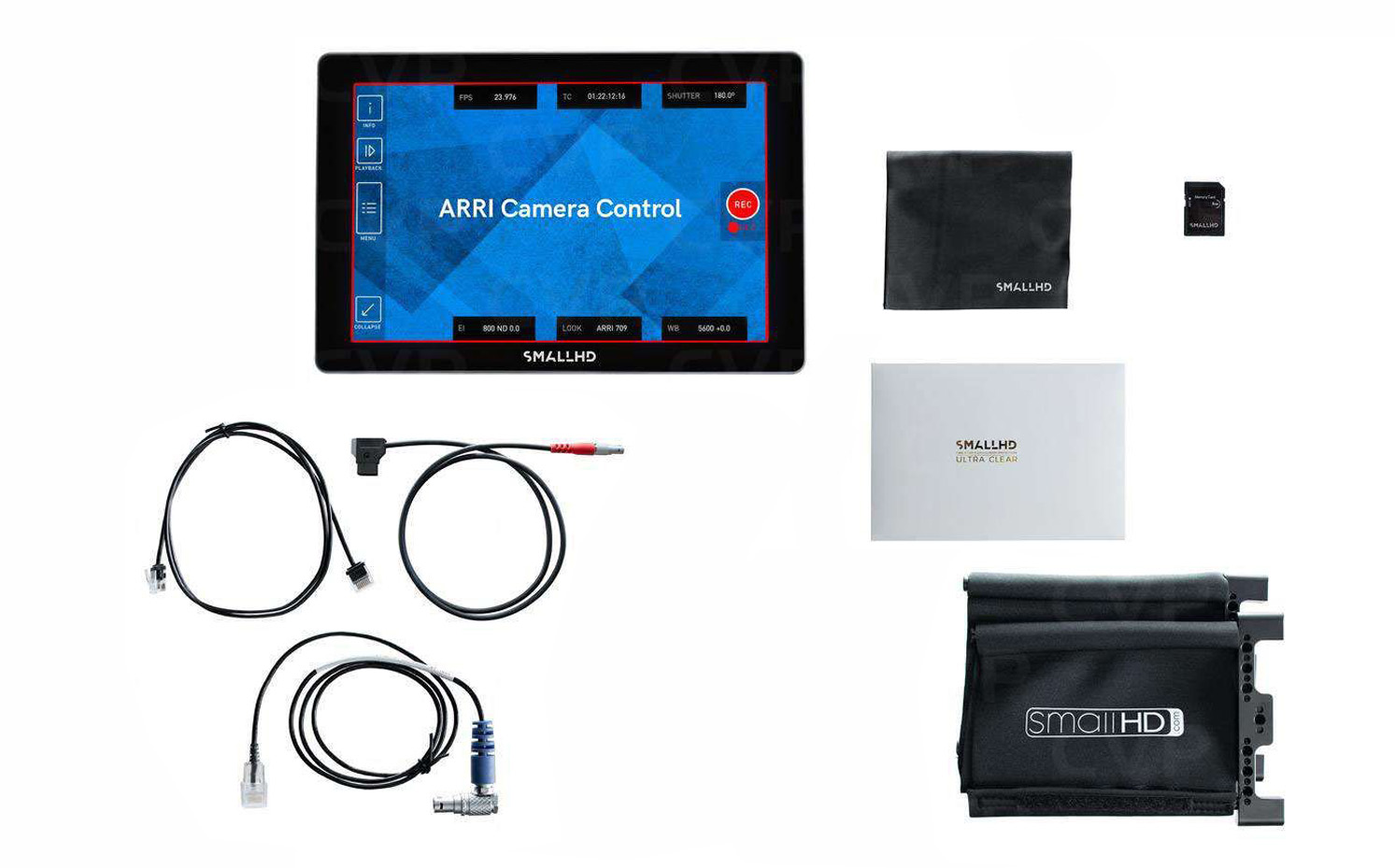 Power supply with powercon cable V-Mount Plate, Cable XLR 4pol 1x 3m, 1x 1m, Cable XLR 3pol 1x10m 1x 3m, Super Clamp Adapter, center mount yoke